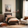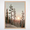 My woodland wall art, Pine Dusk, captures this gentle moment, showcasing a warm sun softly glowing behind a tree-lined hill.