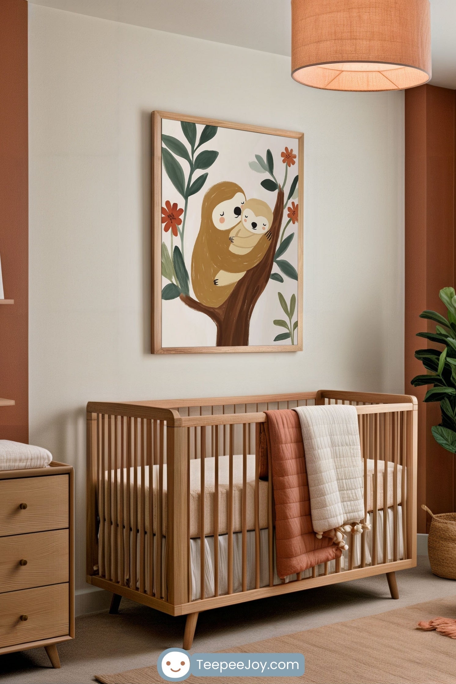 Sloth Wall Art for Nursery, Playroom or Kids Bedrooms - Cozy Watercolor Sloth Mom and Baby with Floral Details - Slow Embrace